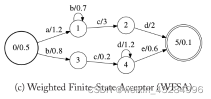 加权有限状态接收机(Weighted Finite-State Acceptor/WFSA):其每个边上增加了一个权重weight,此外初始状态和终止状态也有对应的初始weight和终止weight。其中weight通常表示状态跳转的概率或者代价,一条路径中的weight通过“乘法”累计,不同路径的weight通过“加法”累计。从而输出接受的不同路径的度量。WFSA如下图所示:
