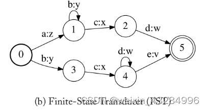 有限状态转录机(Finite-State Transducer/FST):其每个边上是一个pair<输入标签:输出标签>,如下图所示: