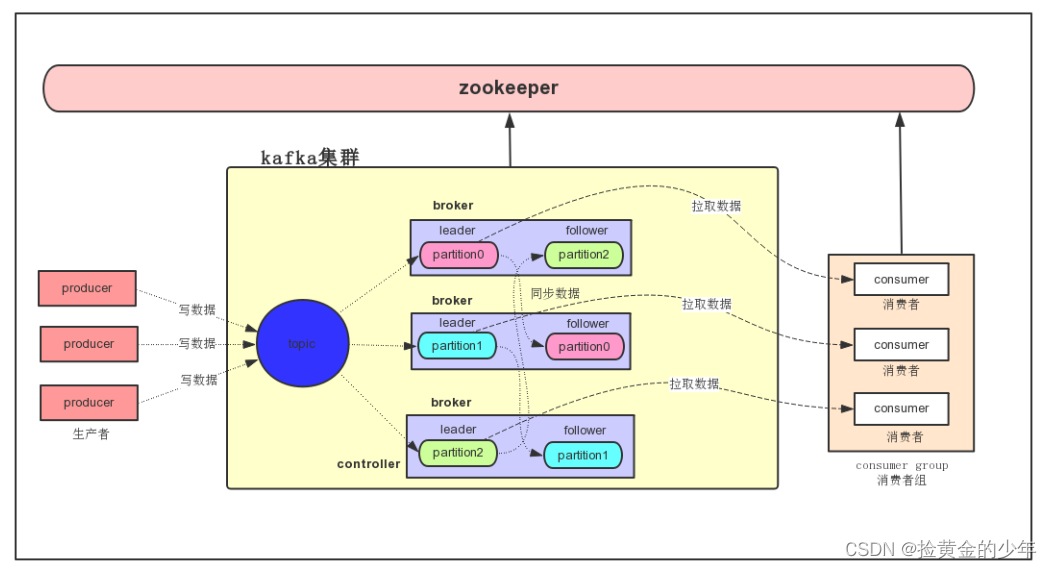 更通俗的说Topic就像一个消息队列,生产者可以向其写入消息,消费者可以从中读取消息,一个Topic支持多个生产者或消费者同时订阅它,所以其扩展性很好。