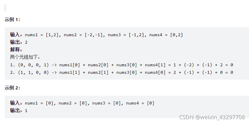 给你四个整数数组 nums1、nums2、nums3 和 nums4 ,数组长度都是 n ,请你计算有多少个元组 (i, j, k, l) 能满足: