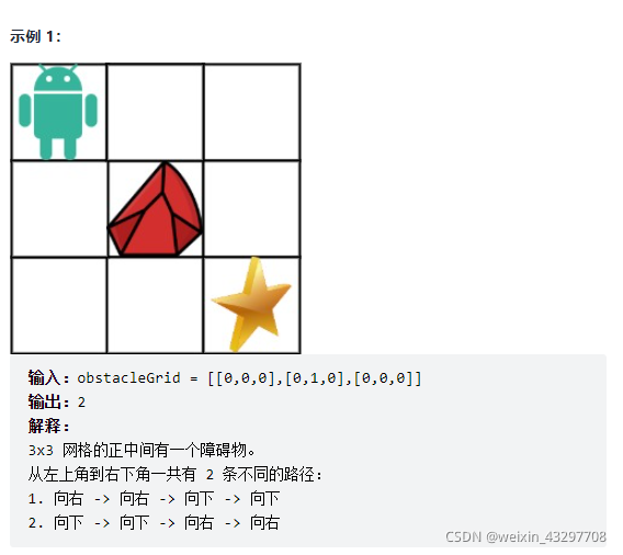 现在考虑网格中有障碍物。那么从左上角到右下角将会有多少条不同的路径?