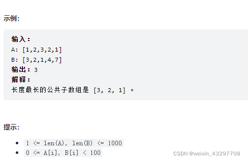 最长公共子数组要求在两个数组中找到一个**连续**的公共子序列,且该子序列长度最长。例如,数组 $A = [1,2,3,4]$ 和 $B = [2,3,4,5]$ 的最长公共子数组为 $[2,3,4]$,长度为 3。