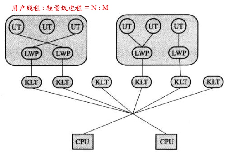 一些 UNIX 操作系统提供了 N:M 线程模型的实现,如 Solaris、HP-UX,不过一般并不主流。