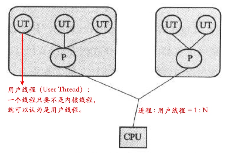 狭义上,用户线程(UT)指的是完全建立在用户空间的线程,即操作系统是感知不到线程的存在的,它只知道那个掌管着这些 UT 的进程 P。因此,进程和 UT 之间的比例为 1:N。