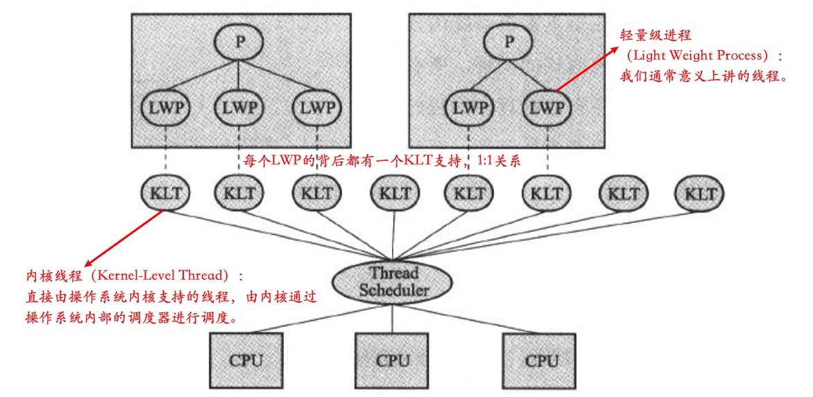内核线程(KLT),就是直接由操作系统支持的线程,不过当然不是我们的程序可以直接去操作操作系统的进程(那样实在是太危险了),而是程序可以通过调用内核线程的一种高级接口 —— 轻量级进程(LWP),来操作内核进程。也就是说,LWP 和 KLT 之间是 1:1 的关系,因此我们也称这种模型为一对一的线程模型。