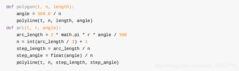 例如:有一个绘制多线段的函数ployLine(t,n,length,angle),其中n是边的条数,length是边长,angle是边与边之间的角度,t在这里指的是python的乌龟模块turtle。我们可以通过改进接口(也就是参数),来重构实现绘制多边形polygon和圆弧arc: