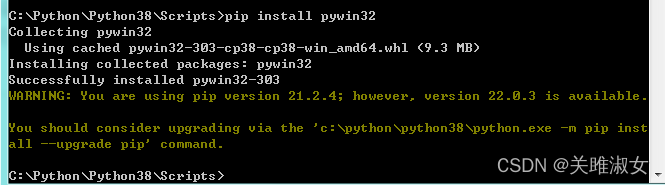 管理员进入cmd,路径进入python安装文件中的Script目录,输入:pip install pywin32;出现以下样式代表安装成功