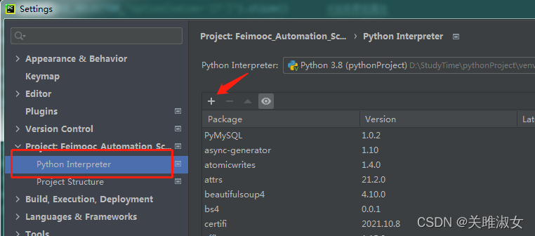 从File---Settings---Pythoninterpreter进入设置页面添加即可