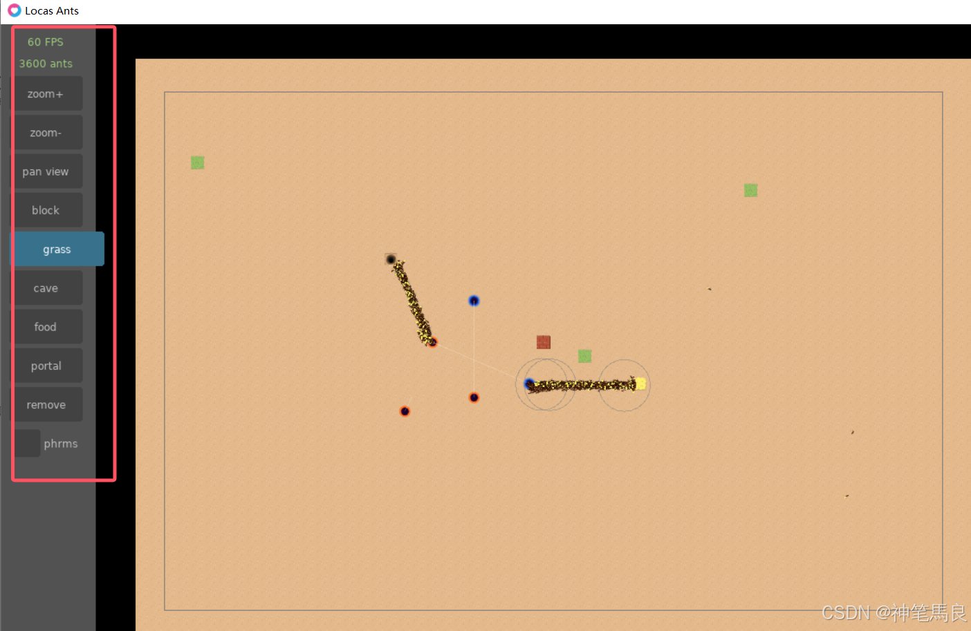 模拟蚁群算法的一个软件叫Locas Ants,里面包含了一些按键叫做zoom+表示放大细节,展示局部视图。zoom-表示缩小局部视图。pan view是什么意思呢?block表示障碍物。grass表示草地。cave表示巢穴。food表示食物。portal表示什么意思呢?remove表示移走添加的食物、巢穴、障碍物、草地等。phrms表示信息素的展示与否,点击对勾表示显示信息素。