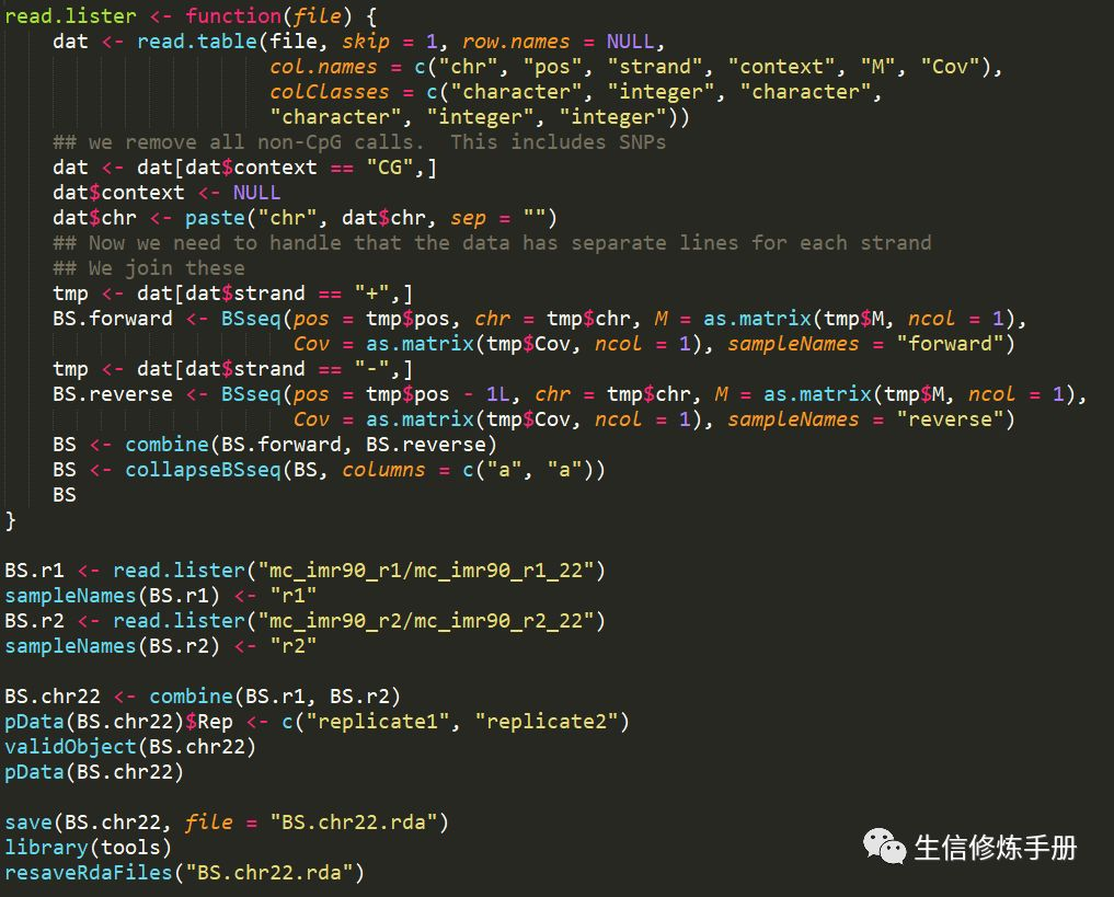 每个样本一个这样的原始数据,用来表示该样本methylation calling的结果,这样的数据我们从bismark的结果中也可以得到。当原始数据准备好之后,首选需要读取所有样本的原始数据,然后导入到R中,生成一个bbseq定义的对象。在bbseq安装的路径下,提供了一个名为get_BS.chr22.R的脚本,展示了如何从读取所有样本原始数据的过程。