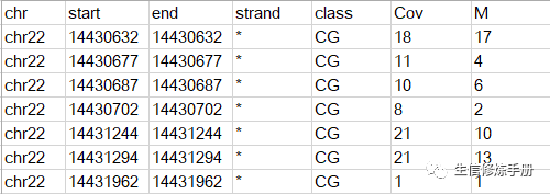 共6列数据,制表符分隔,每一行代表一个甲基化位点,前5列很好理解,描述甲基化位点的染色体位置和类别,默认情况下bbseq用于分析CpG类型的甲基化位点。当然其他类型的数据,比如CHG, CHH也支持,但是需要调整参数。Cov代表覆盖到这个位点的reads数,M代表其中发生了甲基化的reads数目。