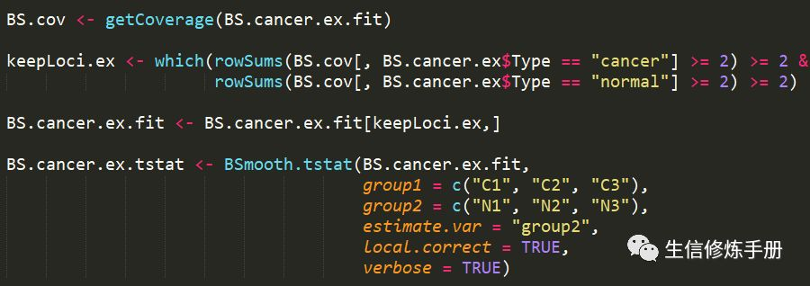 在分析之前,有必要过滤掉覆盖度较低的甲基化位点。通常保留在所有样本中覆盖度大于2的甲基化位点,但是也可以修改这个条件。过滤之后,直接通过BSmooth.tstat进行分析