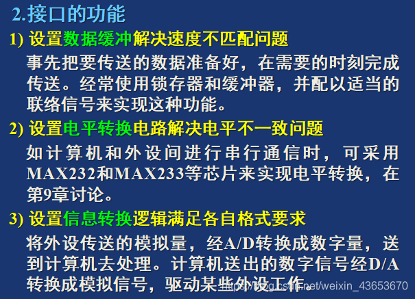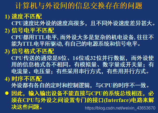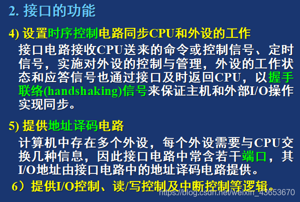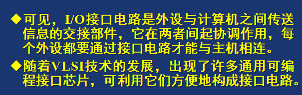 I/O接口是一电子电路(以IC芯片或接口板形式出现),其内有若干专用寄存器和相应的控制逻辑电路构成。它是CPU和I/O设备之间交换信息的媒介和桥梁。作用:对于主机,IO接口提供了外部设备的工作状态及数据;对于外部设备,I/O 接口记忆了主机送给外设的一一切命令和数据,从而使主机与外设之间协调一致地工作。