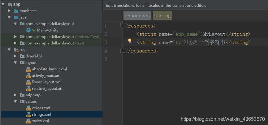 2、给android工程添加一个字符串资源,并将资源内容显示在一个textview控件中。