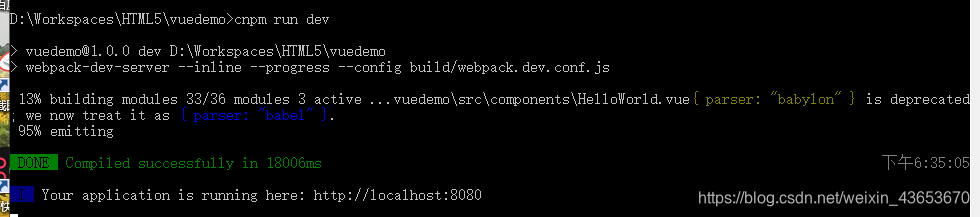执行“cnpm run dev”命令,就会自动打包,生成项目,在浏览器中输入“http://localhost:8080”查看