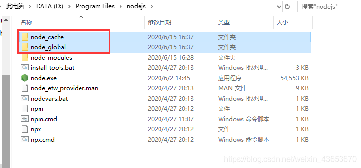 为方便管理,且减轻系统盘压力(默认会把配置和缓存放到个人文档AppData下),将nodejs的node_global和node_cache转移至nodejs安装目录下。