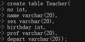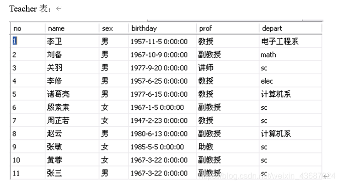 Teacher (no, name, sex, birthday, prof, depart)