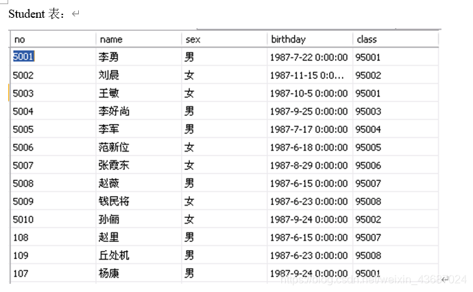 Student (no, name, sex, birthday, class)