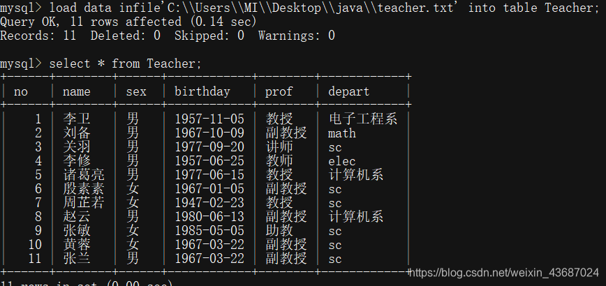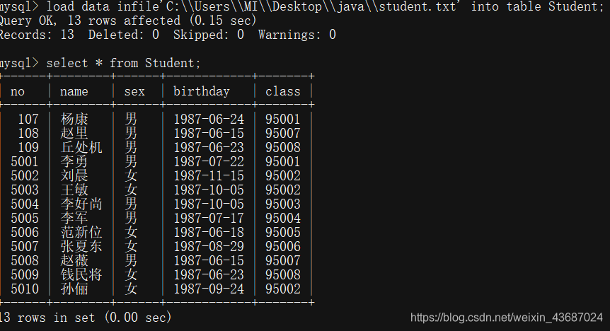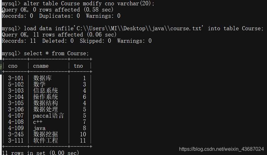 也可以用load data infile方式导入预先写好的txt文件,(注:cno在建表时类型错打成int,所以先改为varchar后再插入