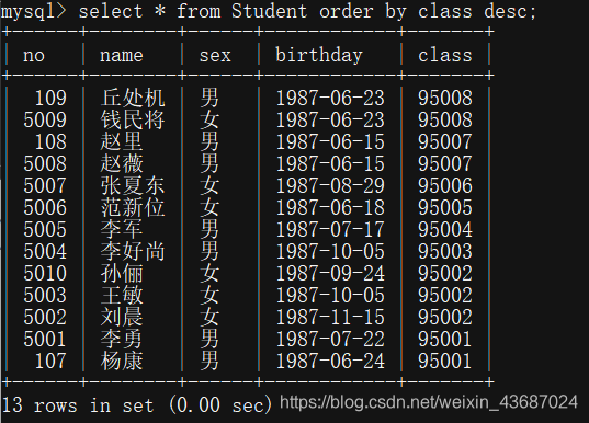 3.以class降序输出student的所有记录(student表全部属性)命令: