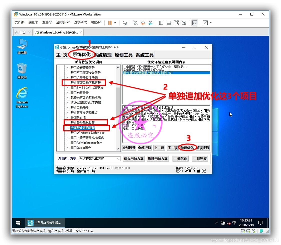 然后单独选择下面的《禁止应用商店自动下载更新》、《禁止各种隐私收集》、《全面禁止系统更新》三个项目优化一下,本人封装的系统习惯将这3个一起优化。这3个优化项目没有归类到《封装推荐优化方案》里,所以要单独挨个优化一下。具体内容看后面的优化说明。