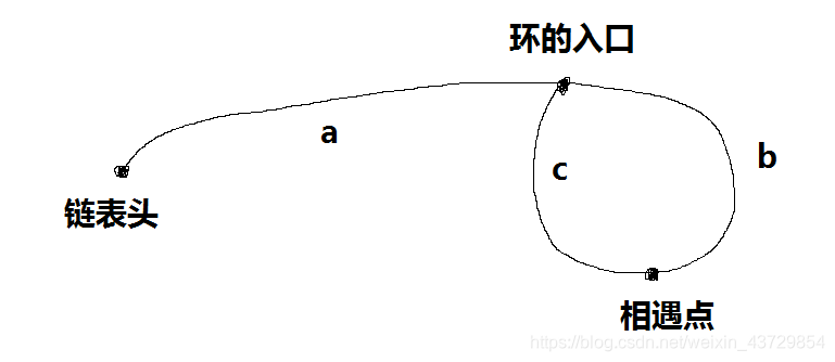 快指针路程=a+(b+c)k+b ,k>=1 其中b+c为环的长度,k为绕环的圈数(k>=1,即最少一圈,不能是0圈,不然和慢指针走的一样长,矛盾)。