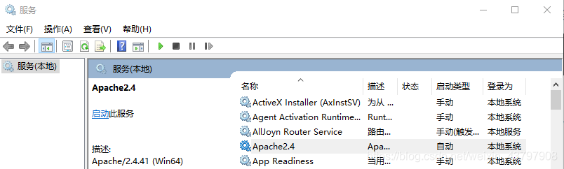windows+R打开运行面板输入services.msc打开服务可以看到成功安装Apache2.4