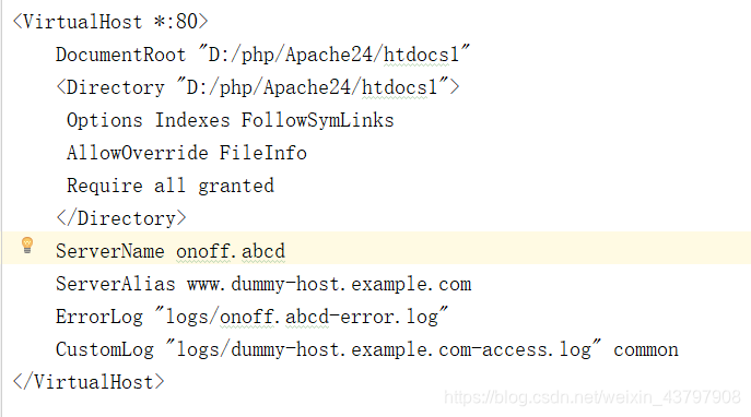 接下来配置多个域名进行访问,在vhosts.conf中增加配置代码,将Document Root改成自己的根目录,将ServerName改成其余需要访问的域名