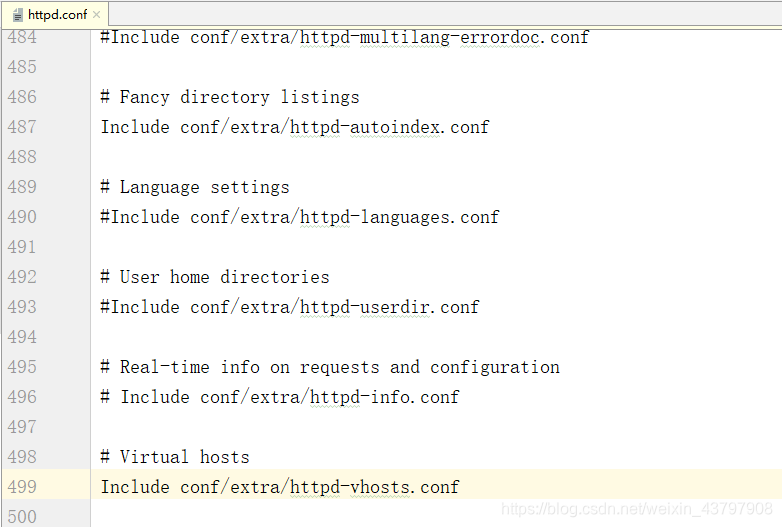 首先要将虚拟主机的使用恢复,载入配置文件,也就是去掉499行的注释