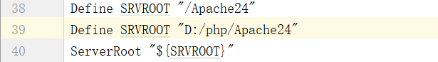 但是上边有一个Errors,提示D:\php\Apache24\conf/httpd.conf第39行有一个错误,需要改正,此文件可以通过webstorm和sublim打开,将文件中的所有SRVROOT替换成如下: