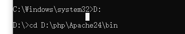 找到windows系统下的命令提示符,右键以管理员身份运行并切换到目标文件夹所在的盘Apache24下的bin文件夹下