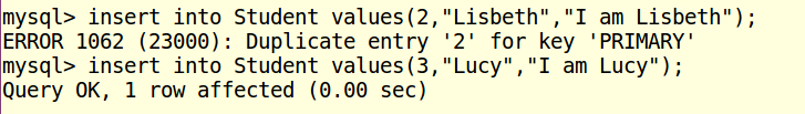 因为StudentID是主键,所以不允许有重复的;名字和profile无所谓。