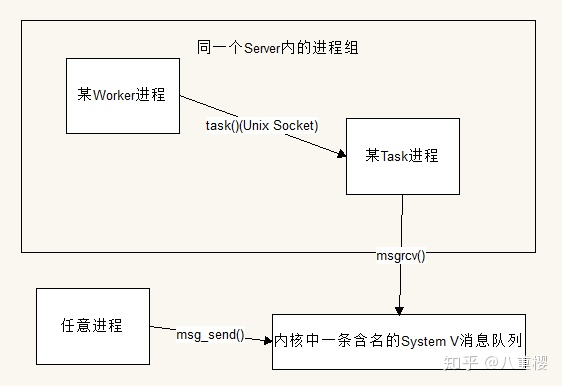 同一个项目中Command和Http\RpcServer 通过约定一个message_queue_key获取到系统内核中的同一条消息队列,然后Comand进程就可以通过该消息队列向Task进程投递任务了。