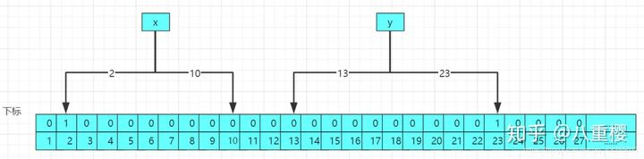 假设在我们多次存入值后,在布隆过滤器中存在x、y、z这三个值,布隆过滤器的存储结构图图如下所示: