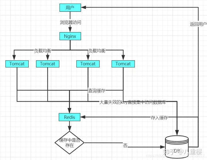 当某一时间点,key大量失效,造成的缓存雪崩的原理图如下: