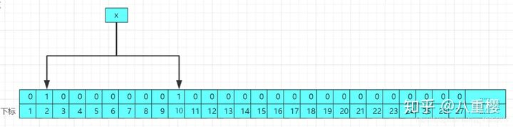 以上只是画了布隆过滤器的很小很小的一部分,实际布隆过滤器是非常大的数组(这里的大是指它的长度大,并不是指它所占的内存空间大)。