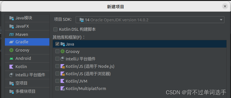 在IntelliJ IDE中创建一个gradle项目,勾选Gradle和Java,并输入工程名