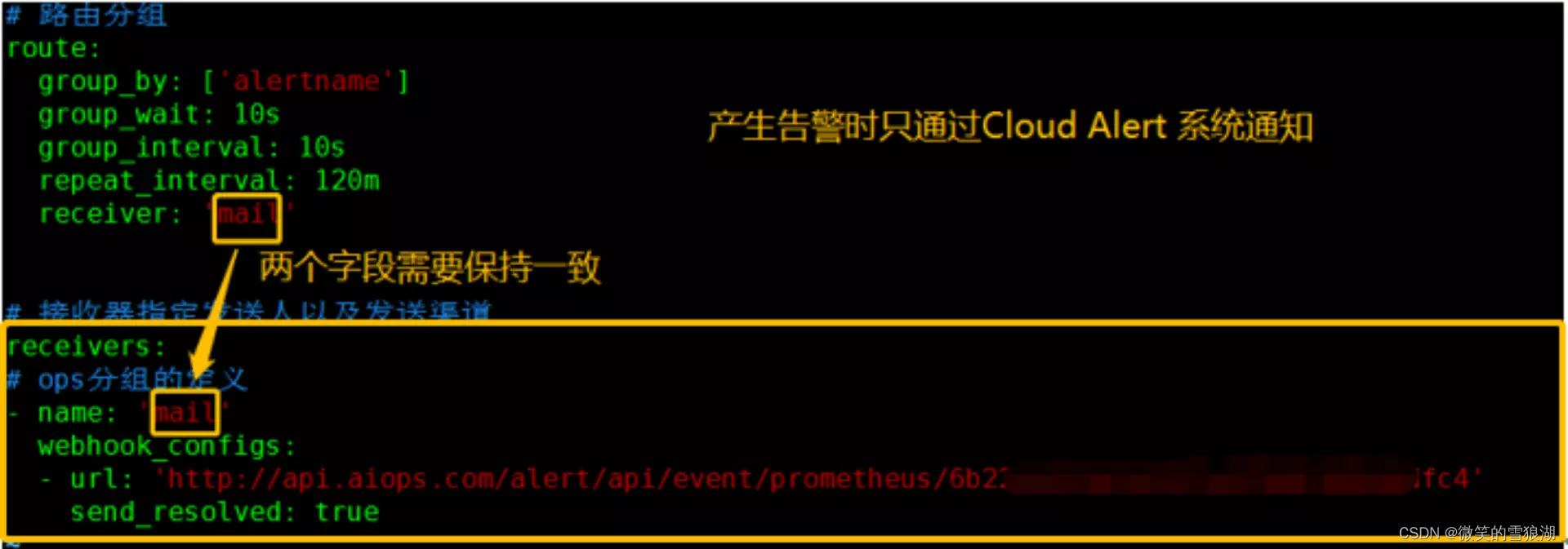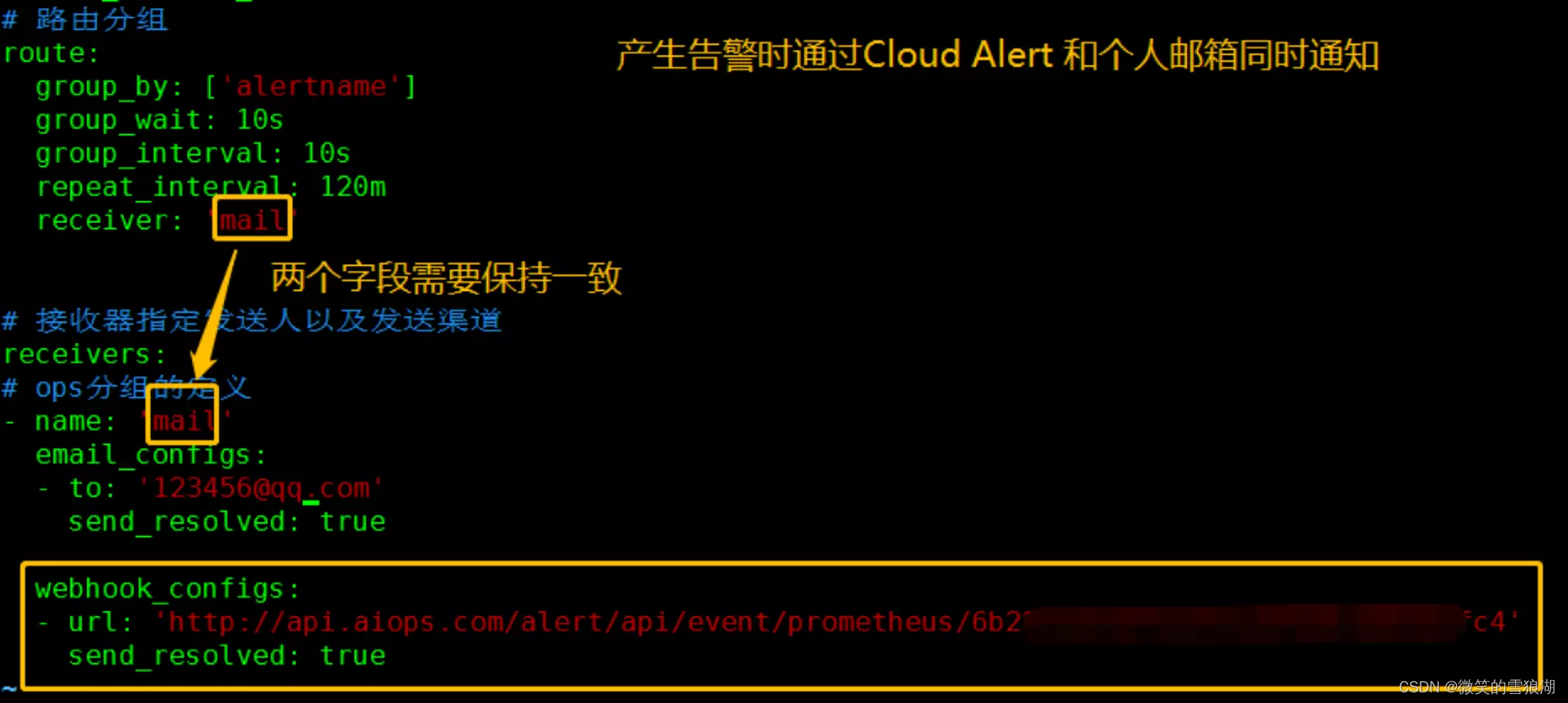 6、 执行vi alertmanager.yml编辑配置文件,新增webhook_configs及以下内容并保存;