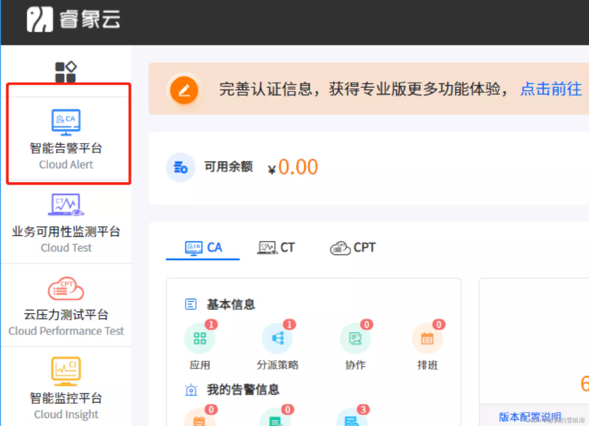 1、 注册CA账号(地址:睿象云-智能运维找睿象),然后登录,并选择“智能告警平台”