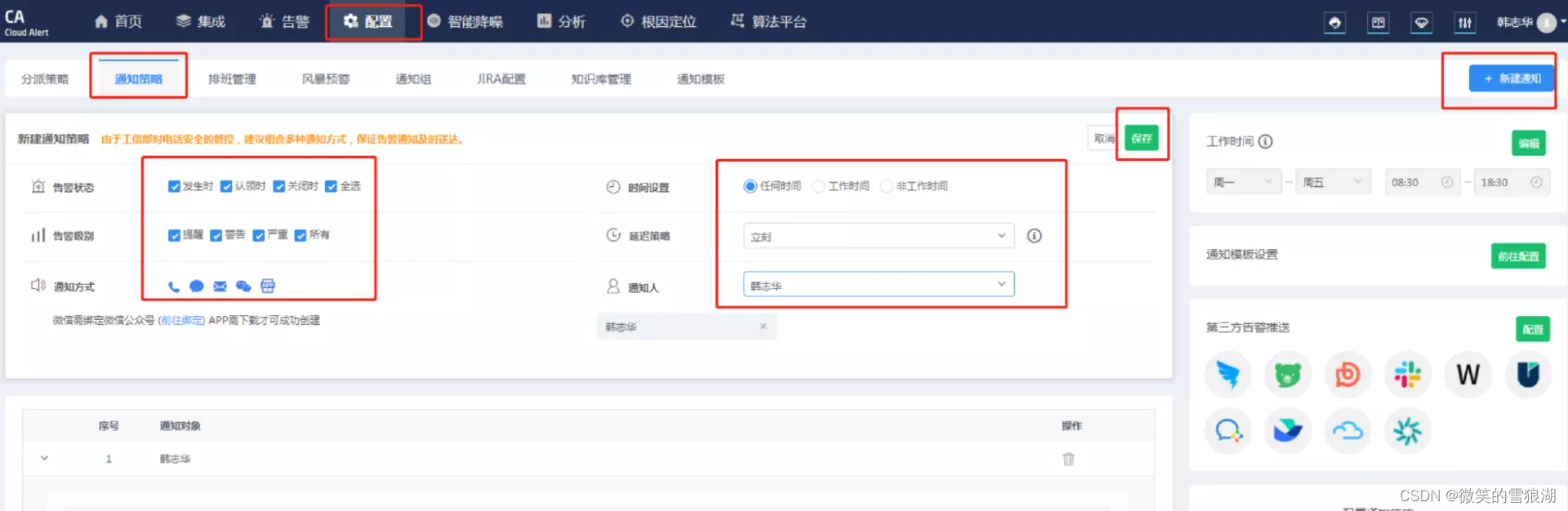 当Prometheus有告警发生时,告警将推送到CA告警平台,CA将根据所配置的告警通知策略通知到告警接收人。