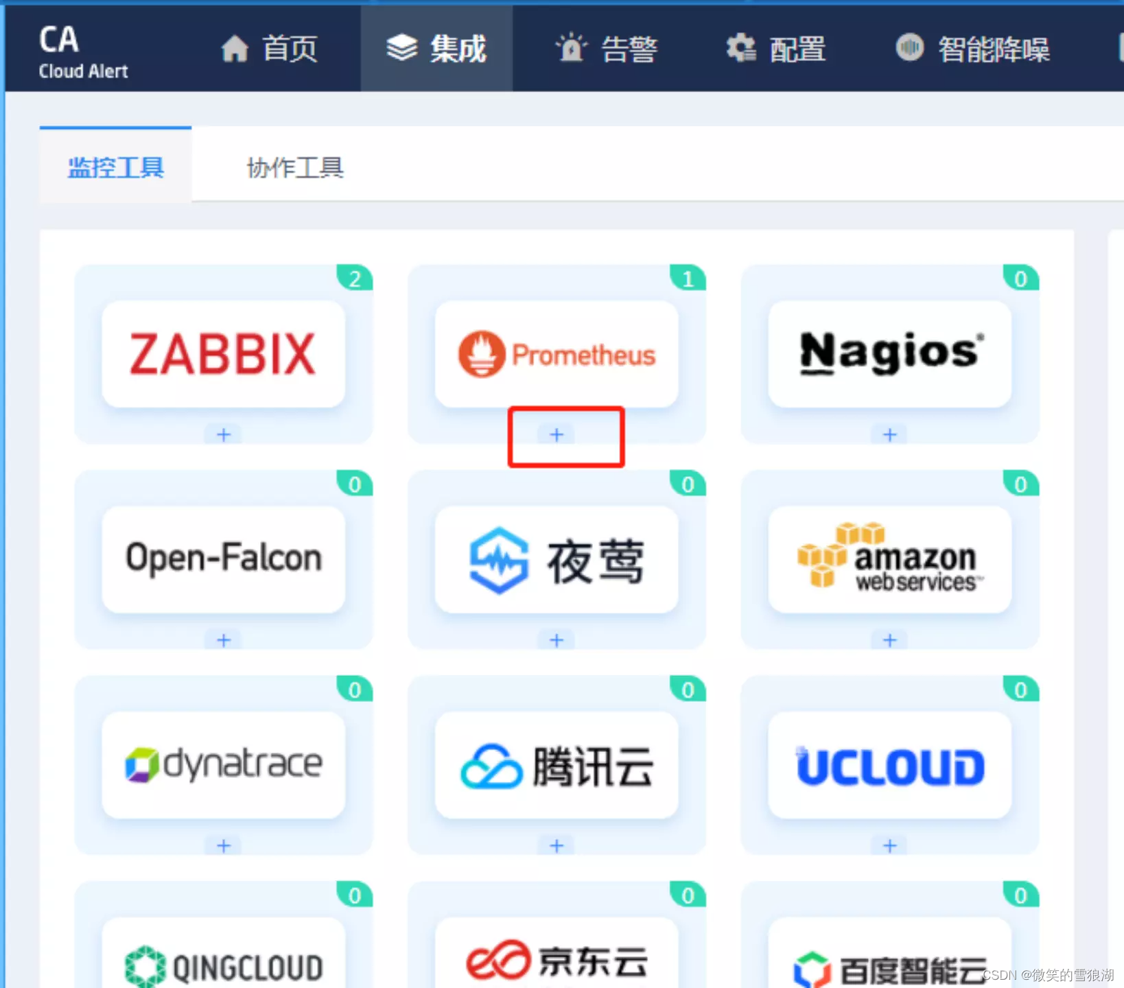 2、 点击“集成”,然后点击Prometheus下的“+” 加号;
