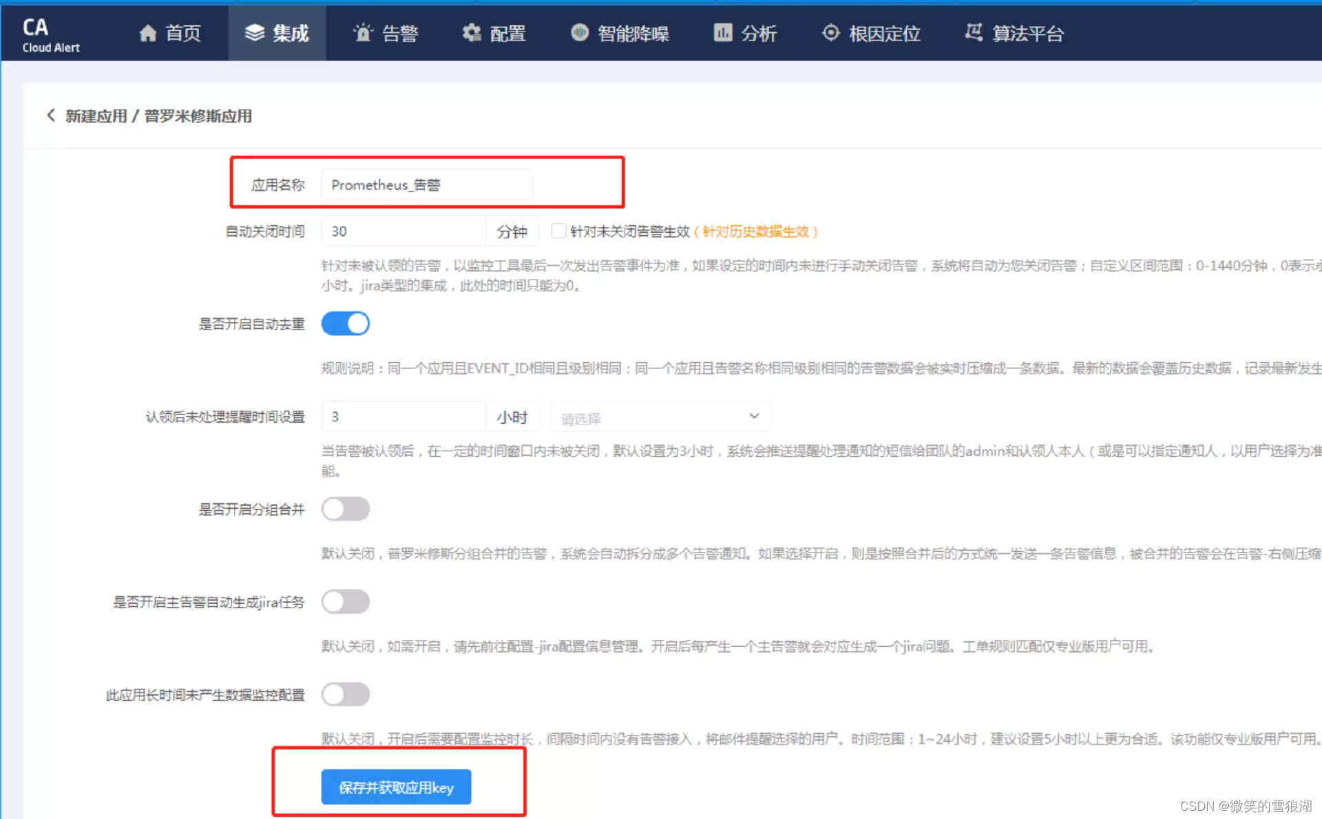 4、 点击“保存并获取应用key”后CA系统会自动跳转到所建应用“Prometheus_告警”详情页面;