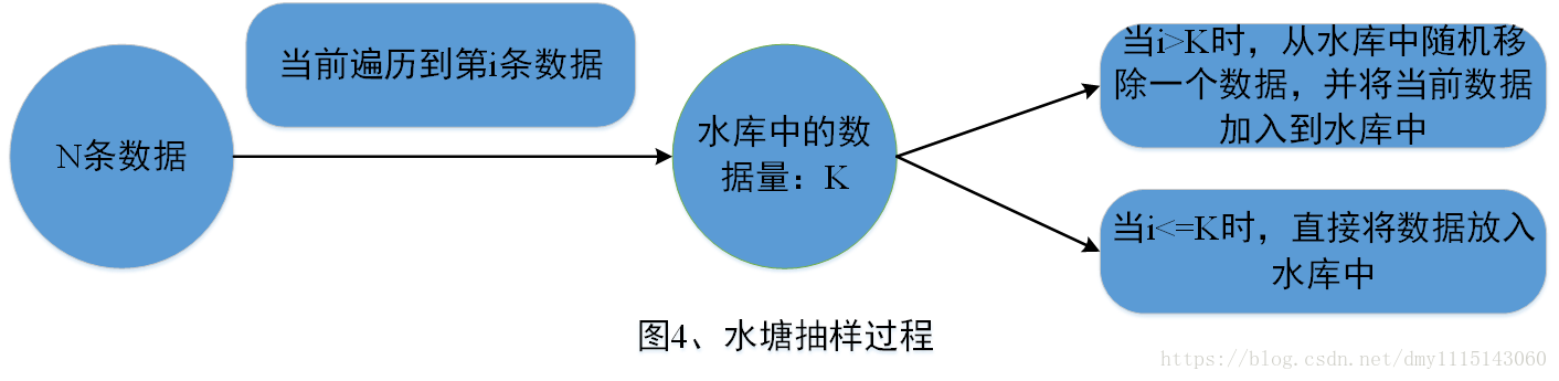 ③ 调用sketch方法进行数据采样:sketch方法返回的结果为<采样RDD的数据量,<partitionId, 分区数据量,分区采样的数据量>>。在sketch方法中会使用水塘抽样算法对待采样的各个分区进行数据采样,这里采用水塘抽样算法是由于实现无法知道每个Partition中包含的数据量,而水塘抽样算法可以保证在不知道整体的数据量下仍然可以等概率地抽取出每条数据。图4简单描述了水塘抽样过程。