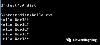 将.py打包为.exe可执行文件,首先需创建一个工作目录,并将需转换为.exe的.py文件放在该目录下,这里,我们在这个文件中写了五句输出“Hello World!”的语句。以管理员身份运行CMD,在该目录下使用pyinstaller -F的命令进行转换: