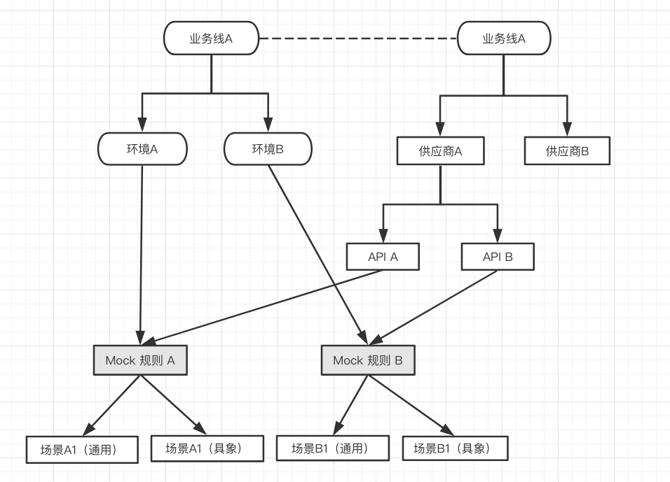 主要包含业务线信息配置、环境配置、供应商配置、供应商所属 API 配置、Mock 规则配置。业务信息之间的关系如下 :