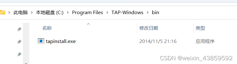3.驱动安装好后在C盘中找到TAP-Windows\bin中的exe文件(版本不同名称不同,我的是tapinstall.exe),双击exe文件增加虚拟网卡