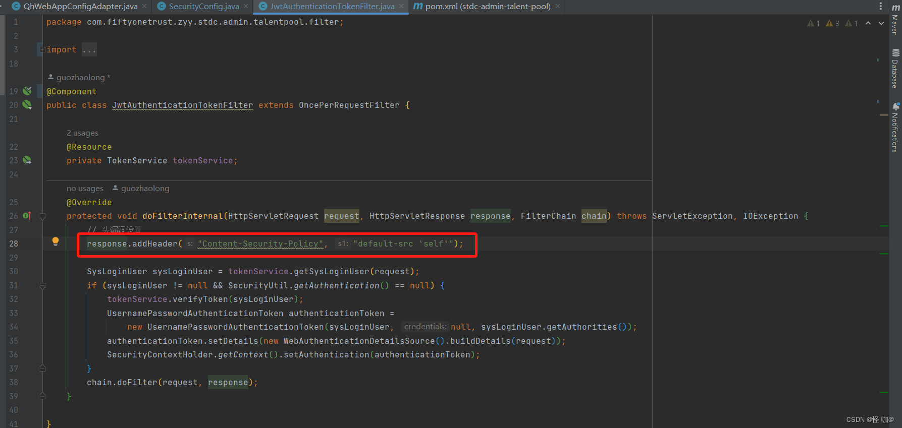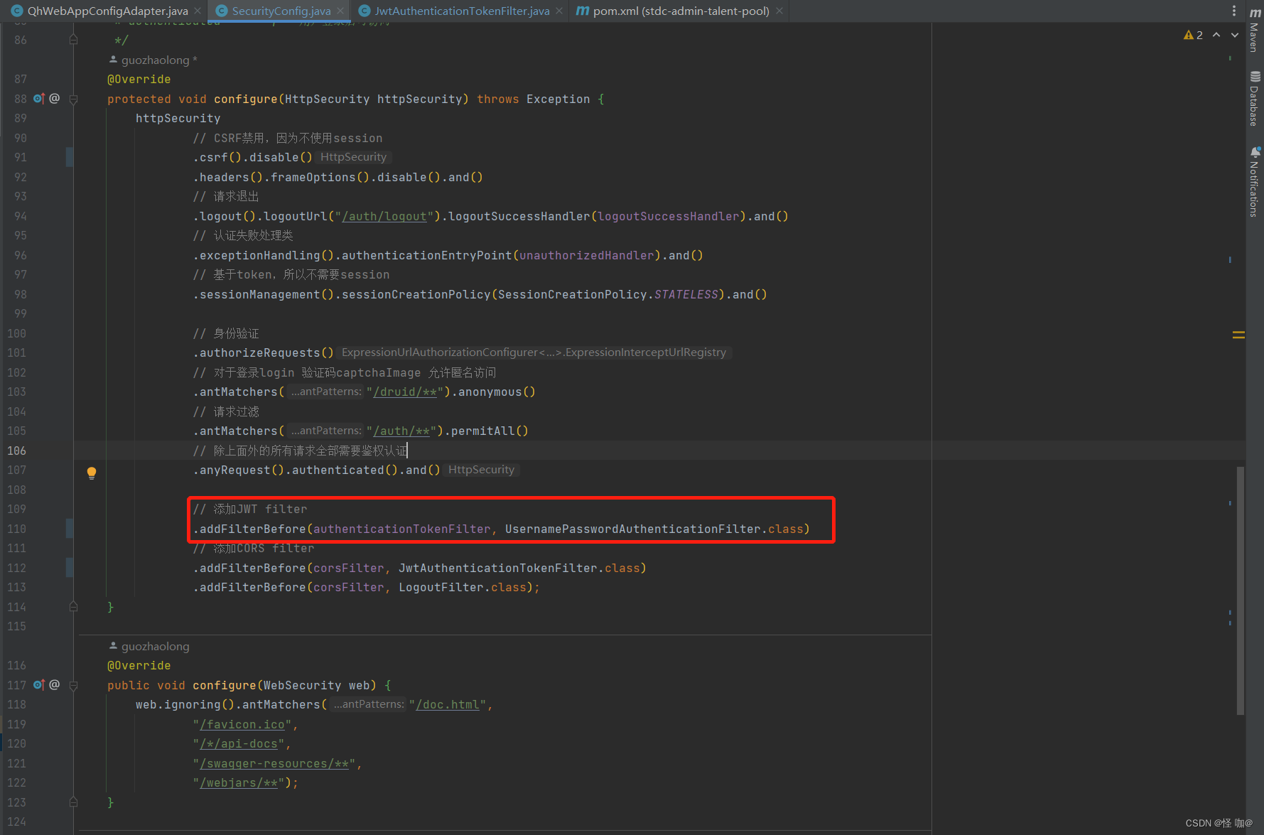 这里使用到了一个JwtAuthenticationTokenFilter过滤器,过滤器当中有一行这个代码注释掉之后就可以了。