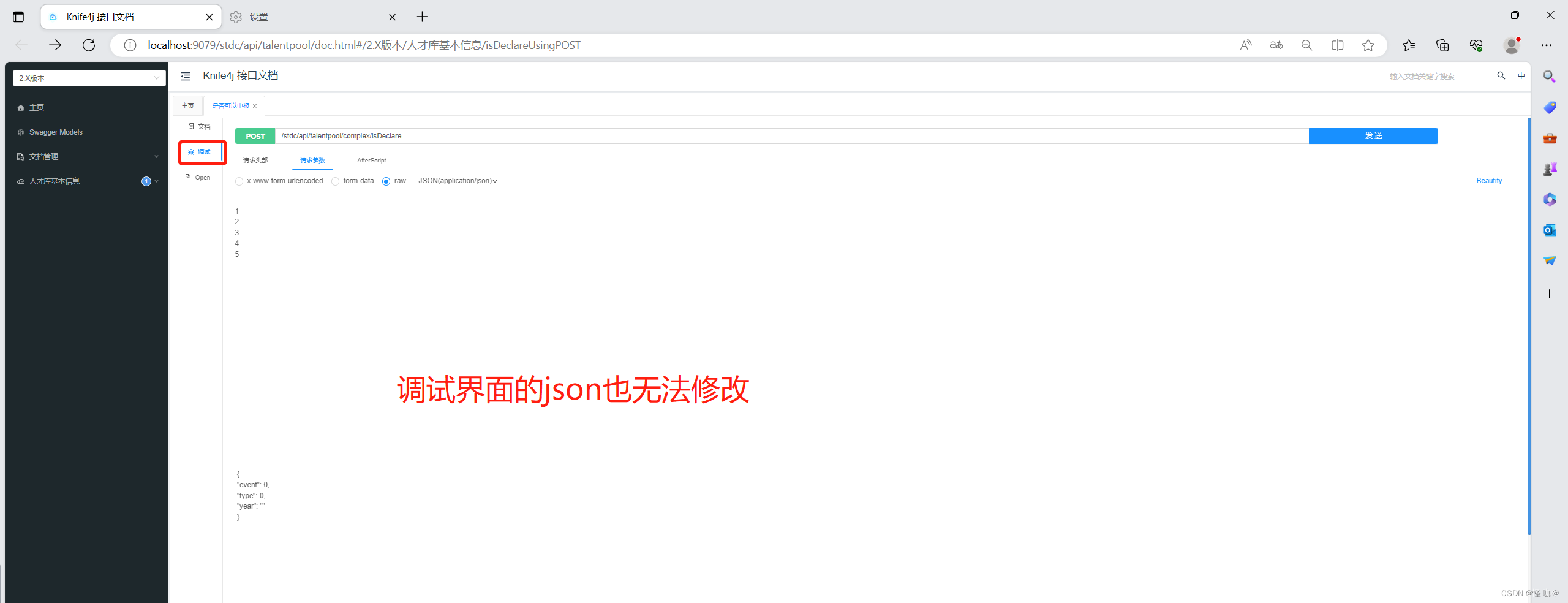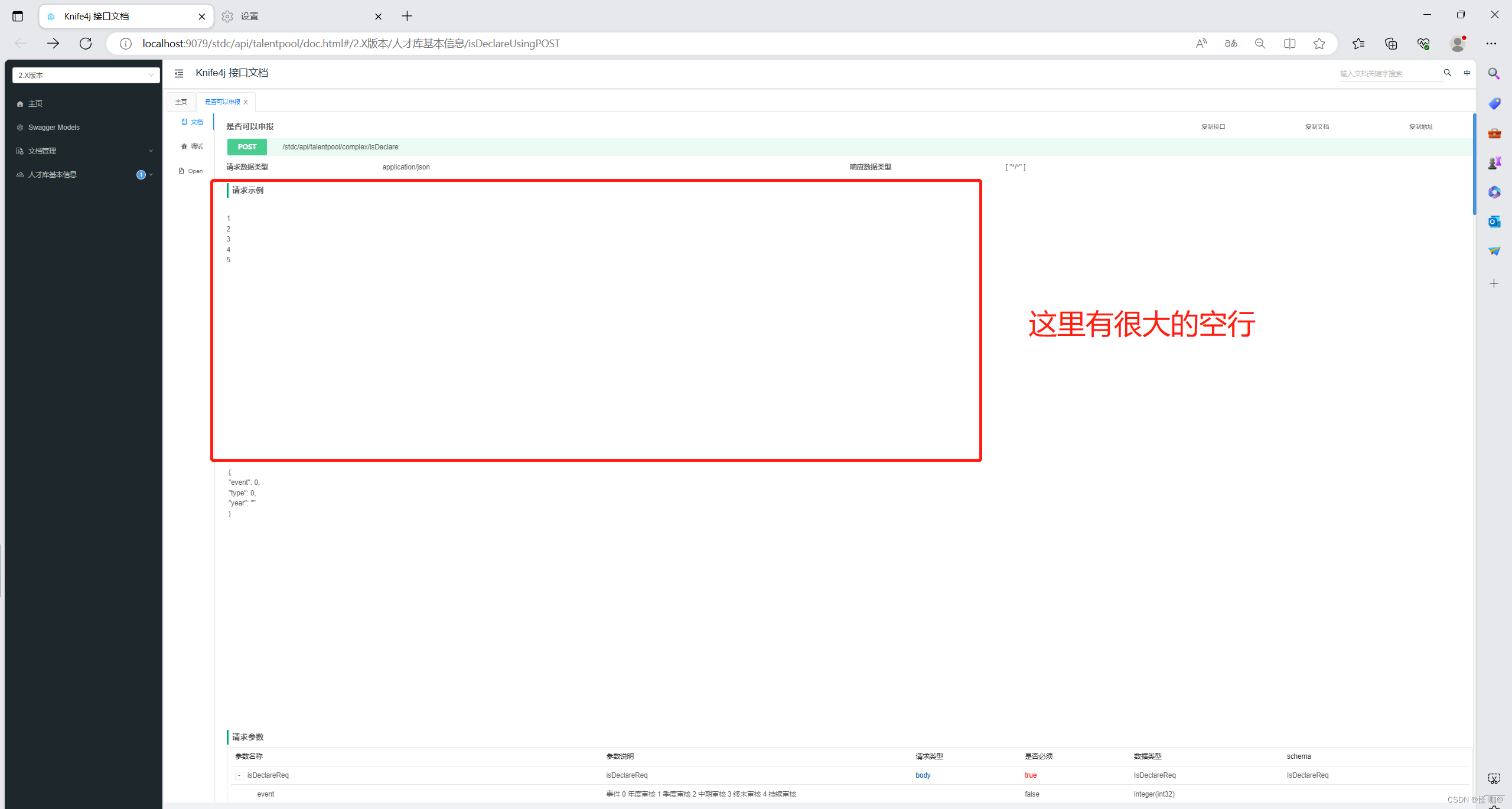 按正常来说不应该有上方的空白,当然如果只是查看我也不至于非要解决他,主要是假如接口是json传参,调试界面都没办法修改参数…网上相关的资料又非常少,我别的项目引用的同样的依赖并没有出现如此情况。