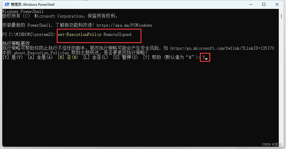 2.执行:set-ExecutionPolicy RemoteSigned 选择Y后进行回车