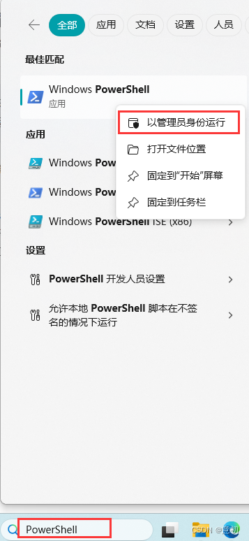 1.开始菜单中搜索PowerShell以管理员身份打开